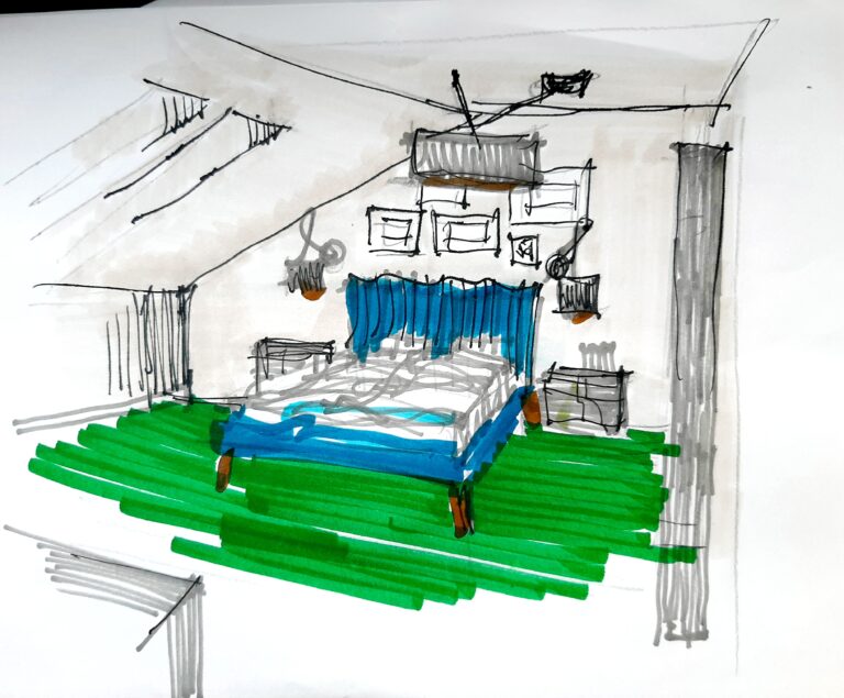 Tu kilka różnych przykładów. Jest nawet sypialnia wynajmowana w Airbnb. Jak widzicie wstępne rysunki mogą niepokoić brakiem użycia komputerowego sznytu, ale korzystamy z tego że sztuczna inteligencja jeszcze nie potrafi tak nonszalancko rysować. Sypialnia ma być